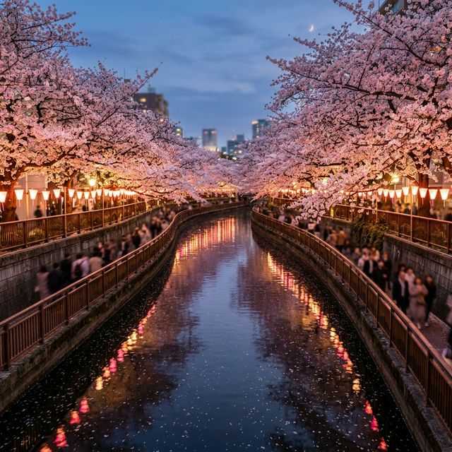 A peaceful stone path along a canal lined with hundreds of cherry trees. The reflections in the water are pure magic — perfect for that Instagram Reel.